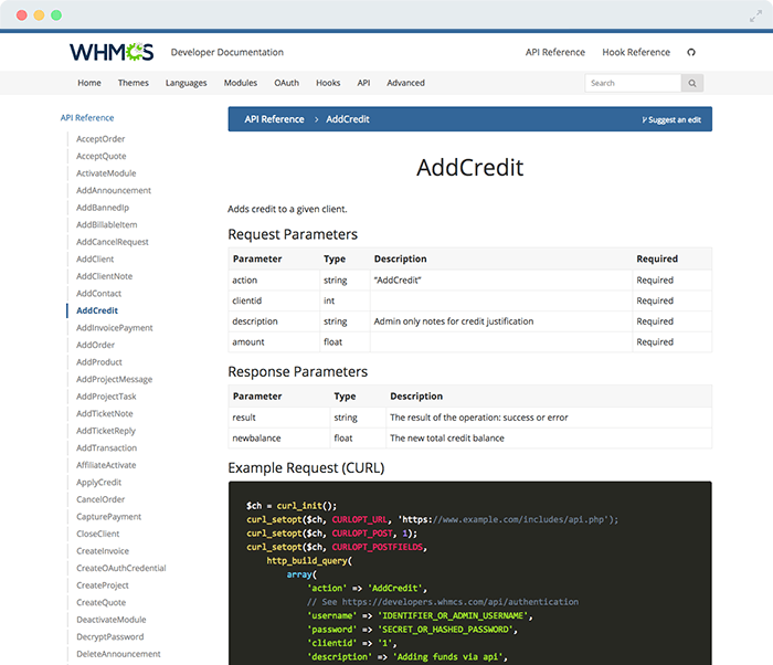 Our JSON and XML API's can be leveraged in both local hooks and modules as well as remotely to execute actions within WHMCS from custom and 3rd party code.