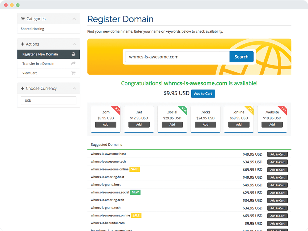 All the tools you need to sell domains including advanced domain suggestions and a fully featured self service management portal for customers.
