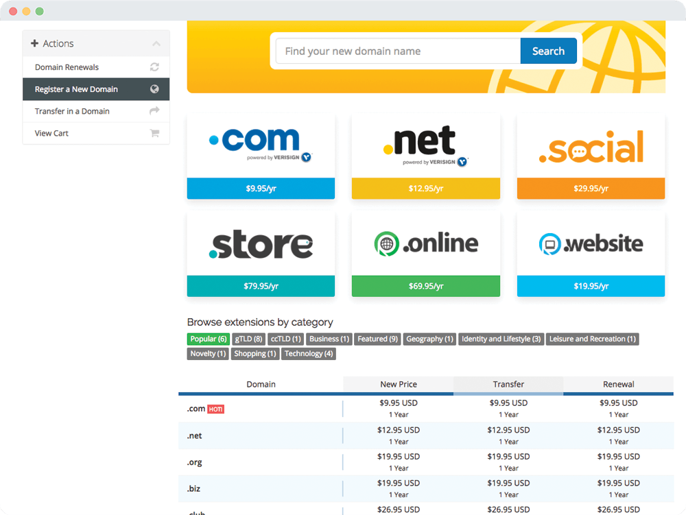 We integrate with all the major domain registrars to provide automatic registration, real time domain availability checking, nameserver management, automatic renewals and more.