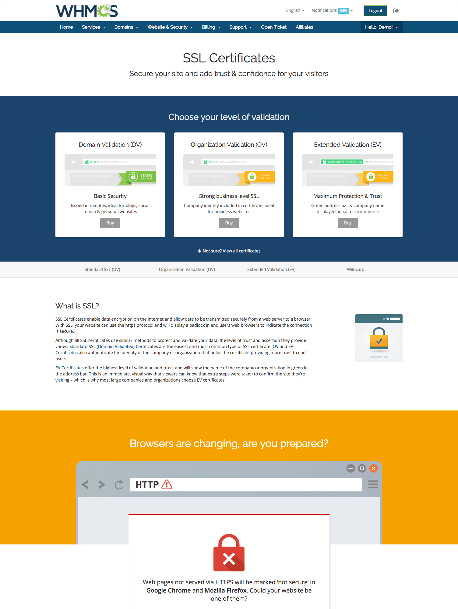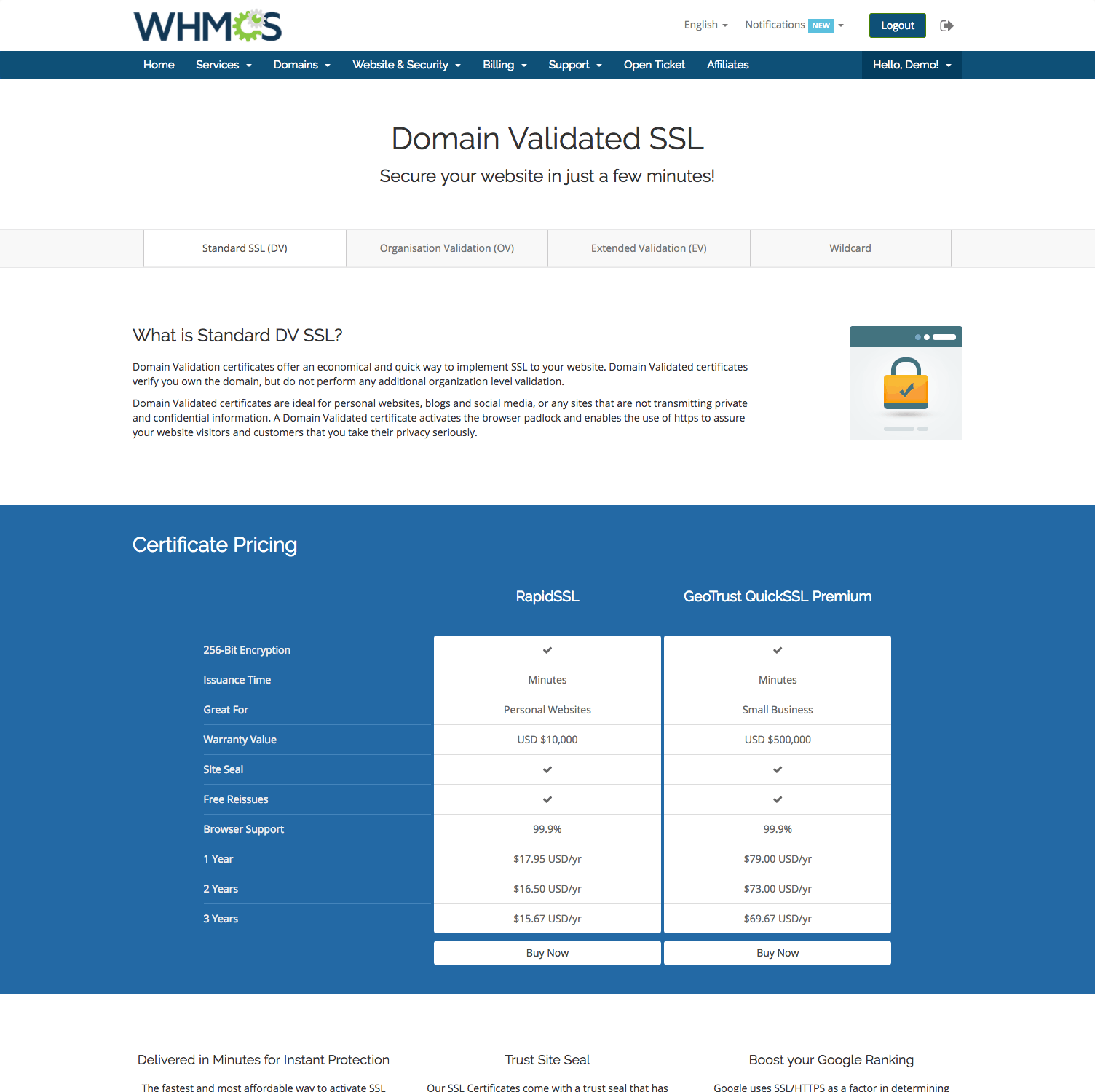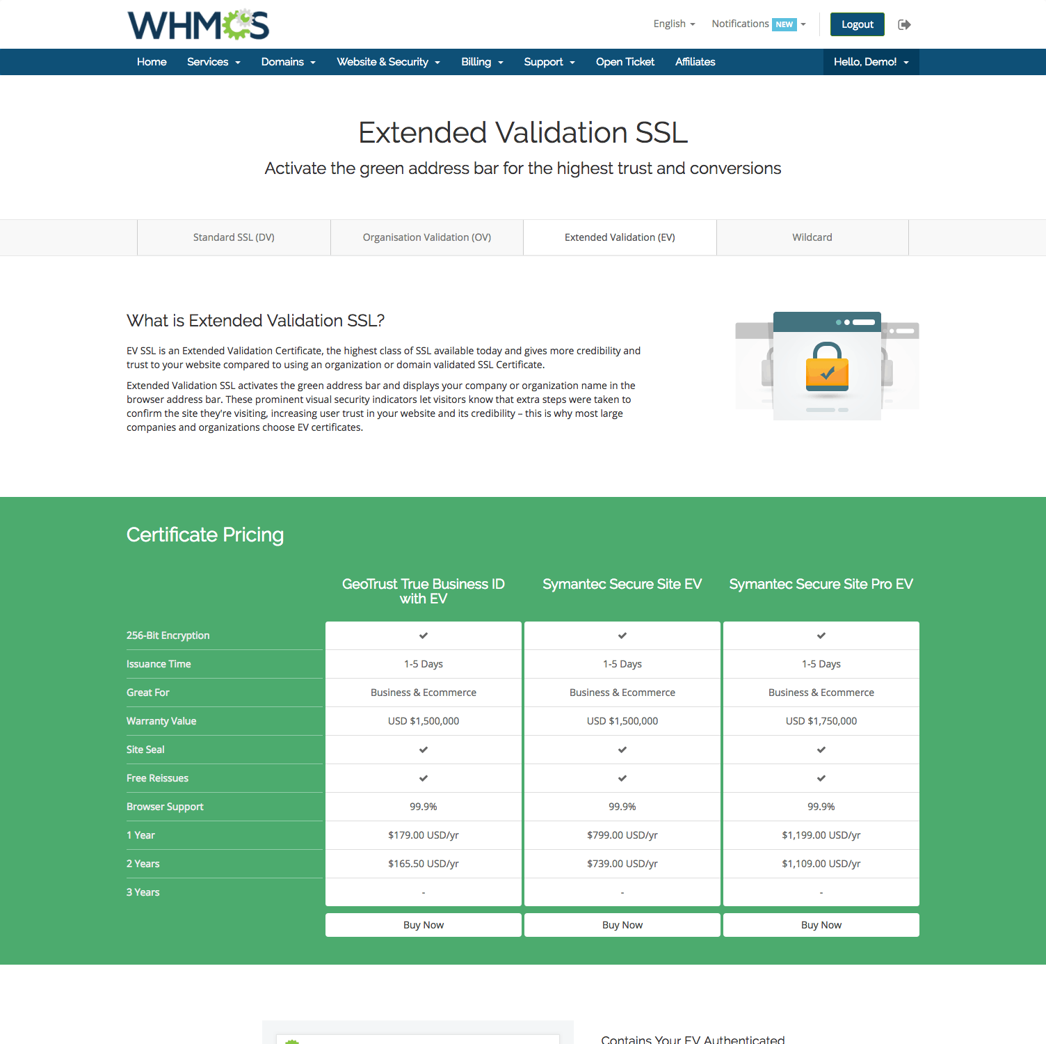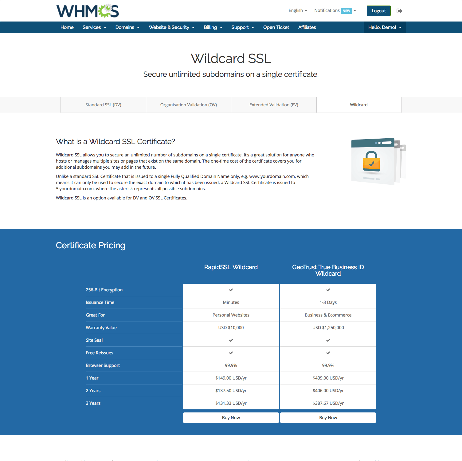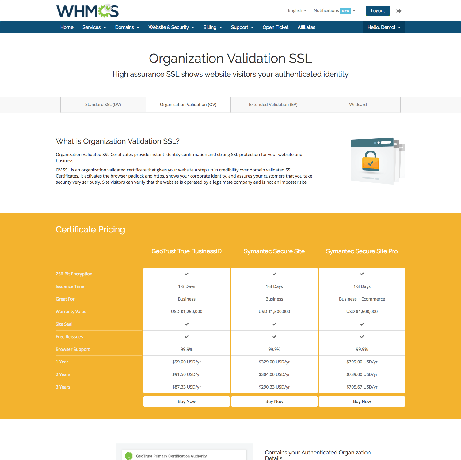 We've teamed up with Symantec to be able to bring WHMCS powered web hosts full end-to-end SSL Automation with leading SSL brands including RapidSSL and GeoTrust.